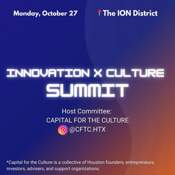 Register here: https://luma.com/1yqp8whr This event will spotlight the power of entrepreneurship and investment in Houston. Join us on October 27th for the Innovation x Culture Summit! The Innovation x Culture Summit will feature a Founders' Spotlight, strategic networking, and a vibrant Black Futures Showcase featuring startups and scalable small businesses. If you're interested in participating […]