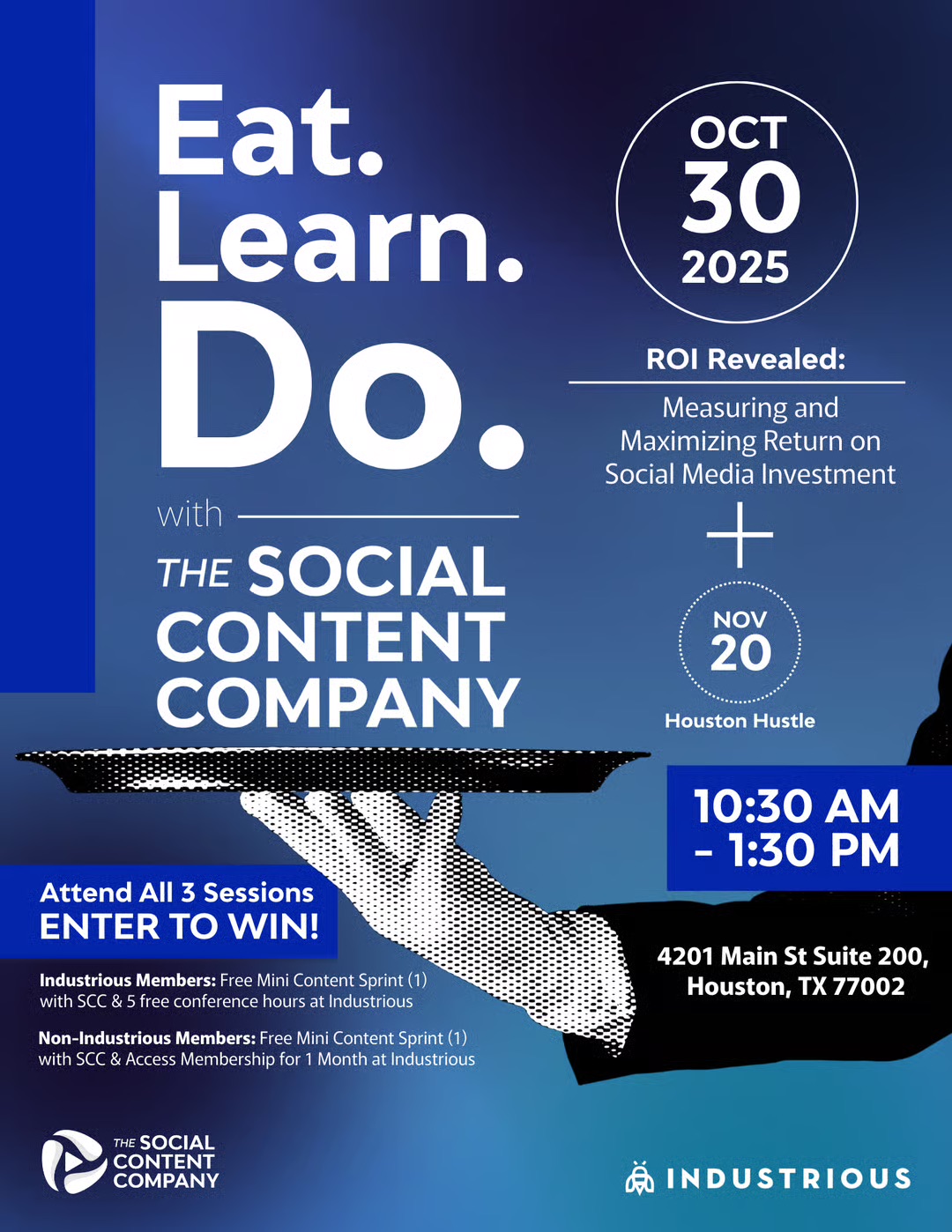 Register here: https://posh.vip/e/roi-revealed-measuring-maximizing-return-on-social-media-investment-1 Eat. Learn. Do. with SCC Join Industrious at the Ion for an engaging three-part event series presented by SCC, designed to empower Houston’s entrepreneurs, creators, and business leaders to grow their brands and thrive in the local market. Each session features expert insights, networking opportunities, and actionable takeaways—all over great food and […]