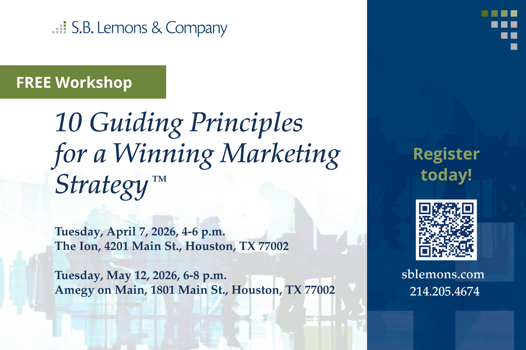 DetailsRegister here: https://sblemons.com/corporate-training/#wmsevents Workshop participants will learn time-tested marketing principles and business frameworks for growth. Key benefits of the workshop include: 1) increased insight into your target customer and how […]